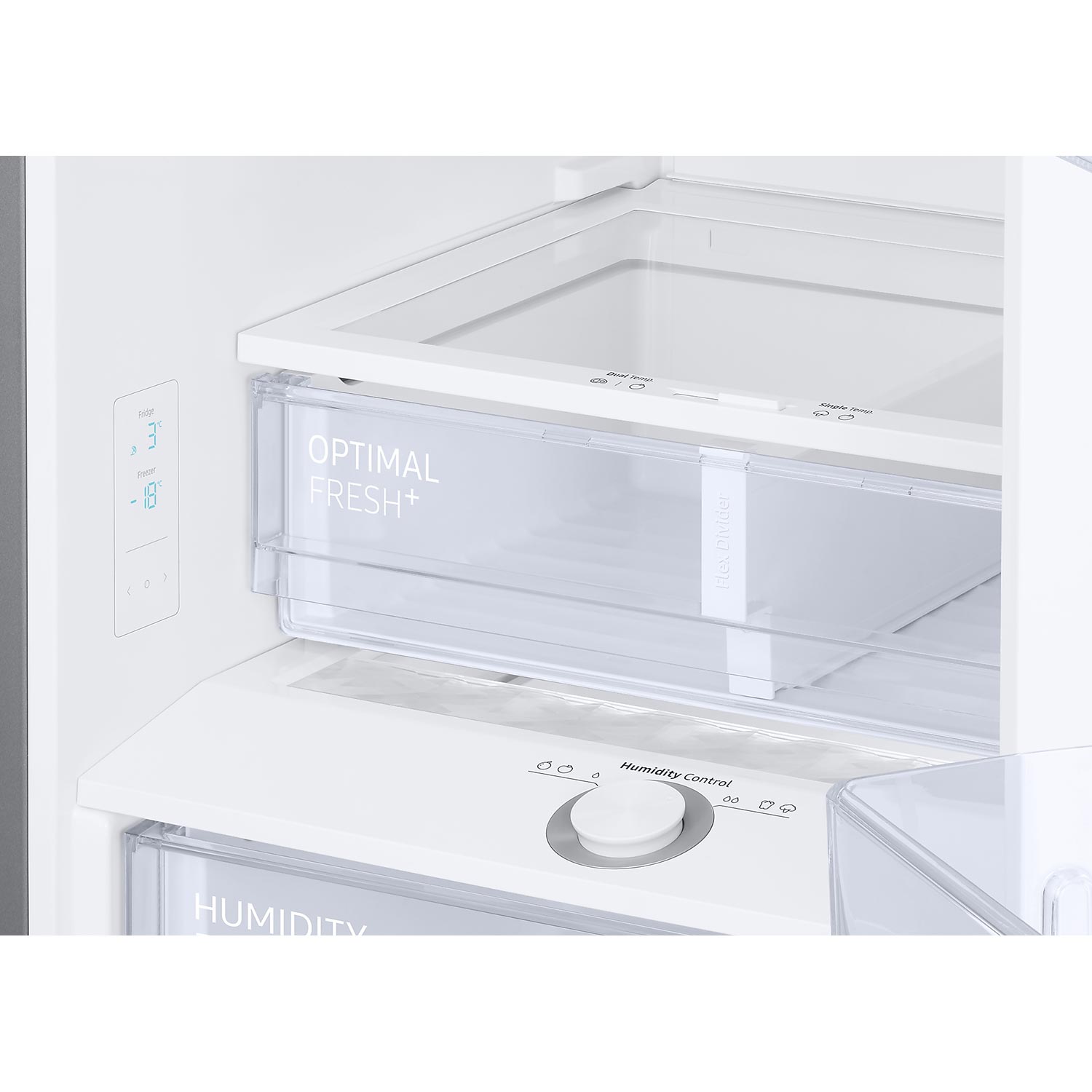 Il comparto Optimal Fresh può essere utilizzato come cassetto unico o diviso in due zone con temperature diverse. Il lato sinistro è più freddo, per cui carne e pesce possono durare due volte più a lungo. Il lato destro è ideale per preservare la freschezza di frutta e verdura. Nel cassetto Humidity Fresh l’umidità può essere regolata semplicemente ruotando la manopola. Crea l’ambiente ideale per conservare diversi tipi di frutta e verdura in modo che rimangano croccanti, freschi e succosi.